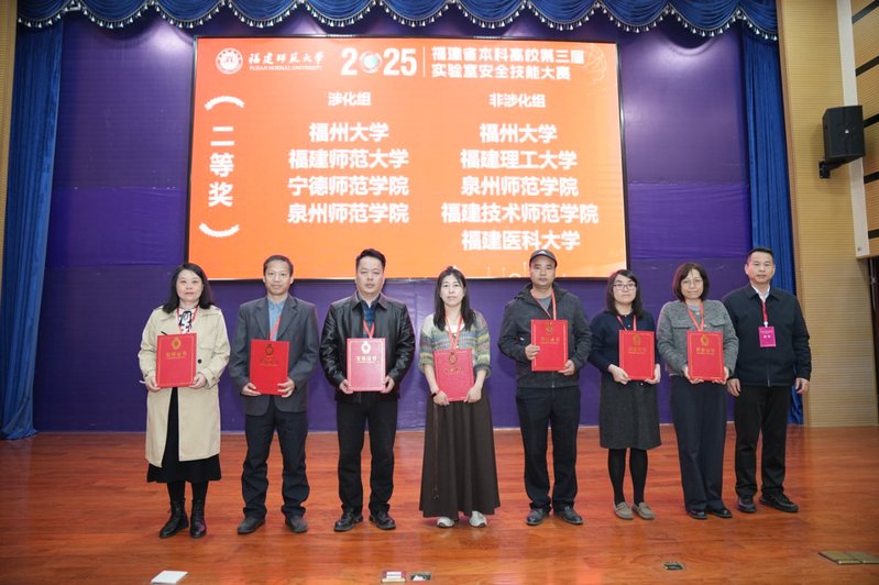 2025年11月30日,由福建省高等教育学会实验室管理专业委员会主办的“福建省本科高校第三届实验室安全技能大赛”圆满落幕。全省37所本科高校共选派64支队伍、近200名实验教师参加比赛,我校选派6名教师组成2支参赛队伍,经过多轮激烈角逐,最终非涉化组荣获二等奖、涉化组荣获三等奖。